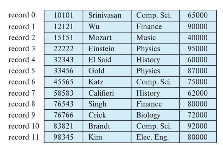 Sequential - store records in sequential order, based on the value of the search key of each record. 顺序存储,基于每条记录的搜索键值。