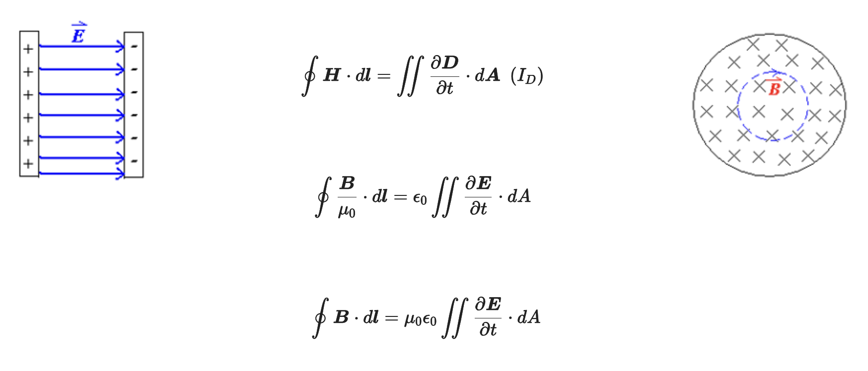 \[ \oint \vec{H} \cdot d\vec{l} = \iint \vec{J} \cdot d \vec{S} + \iint \frac{\partial \vec{D}}{\partial t} \cdot d\vec{S} \\ \nabla \times \vec{H} = \vec{J} + \frac{\partial D}{\partial t}\notag \]