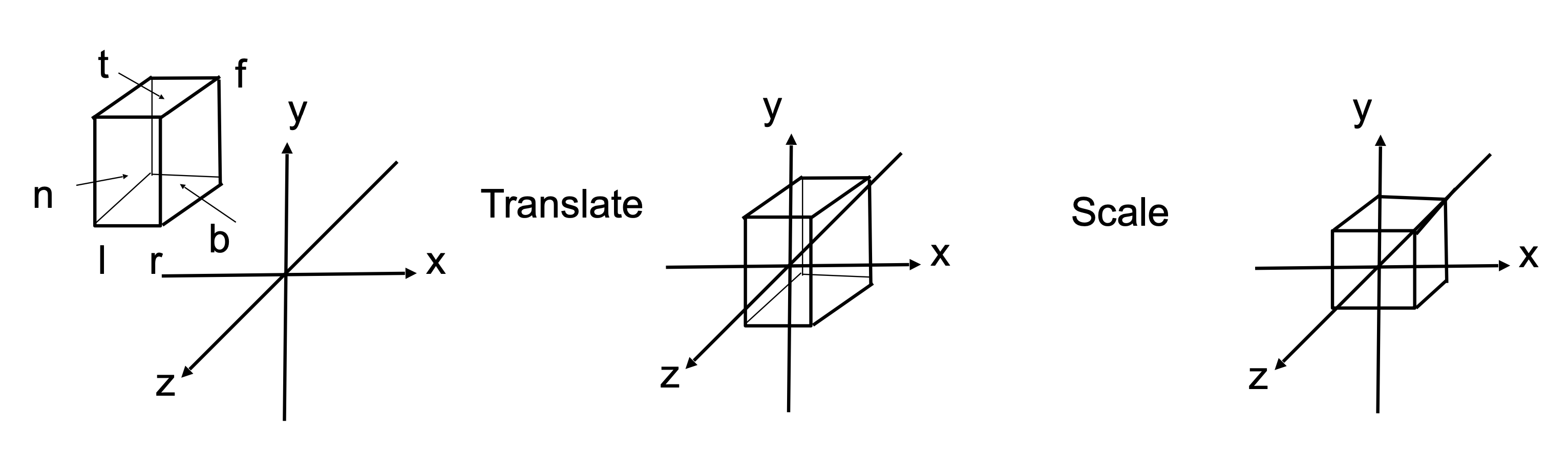 我们可以把这个立方体映射到位于原点处的标准立方体上(\([-1, 1]^{3}\)): 先把立方体平移到原点,然后把 x, y, z 分别缩放到 \([-1, 1]\)。这个过程叫做 canonical(正则,规范,标准)。