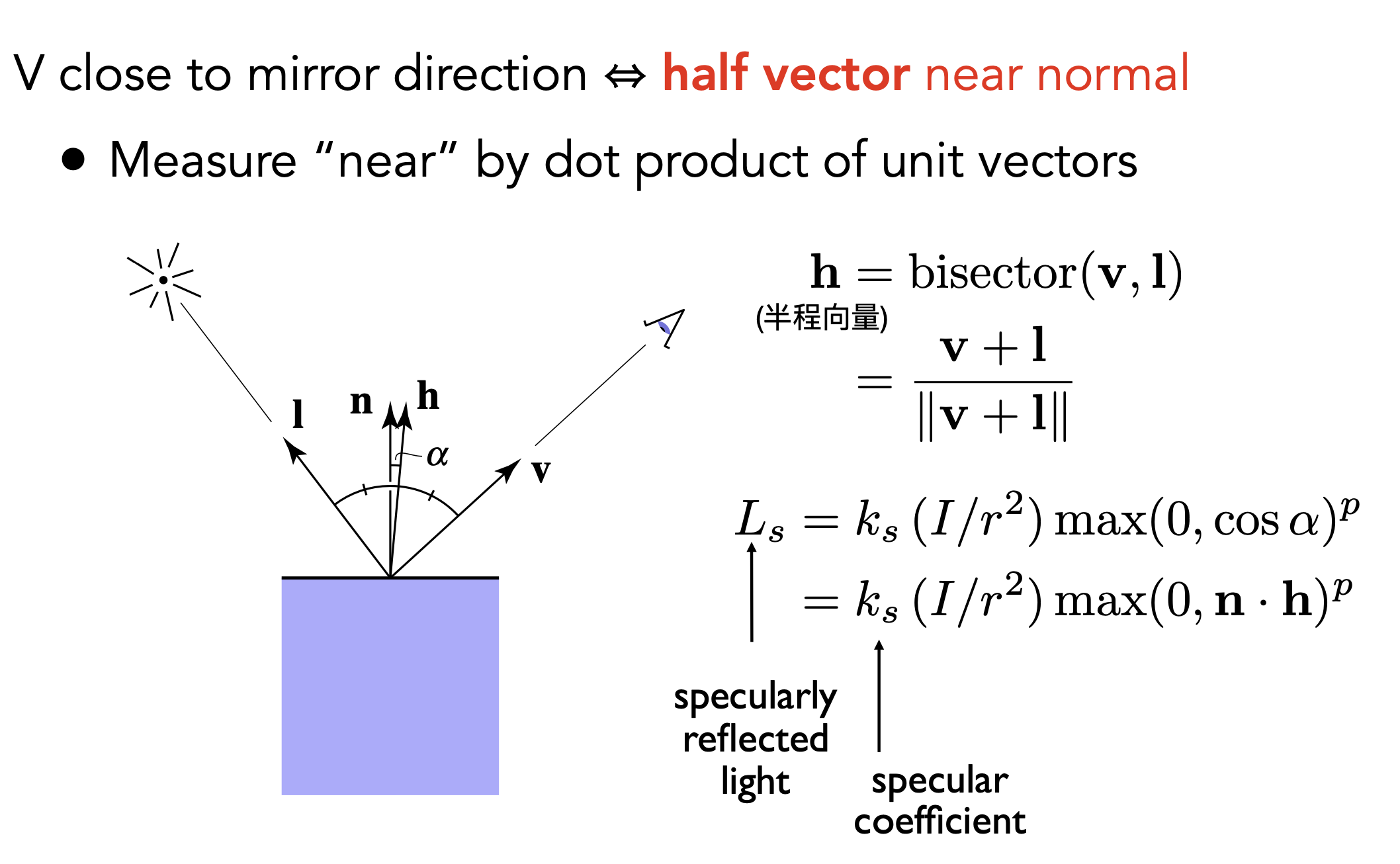 图中的 \(\vec{h}\) 就是半程向量,根据平行四边形法则,我们只要把 \(\vec{l}\) 和 \(\vec{v}\) 加起来,再做归一化,就得到了角平分线,也就是半程向量 \(\vec{h}\)。所以为了衡量我能不能看到高光,只要看半程向量和法线是不是接近就可以了。