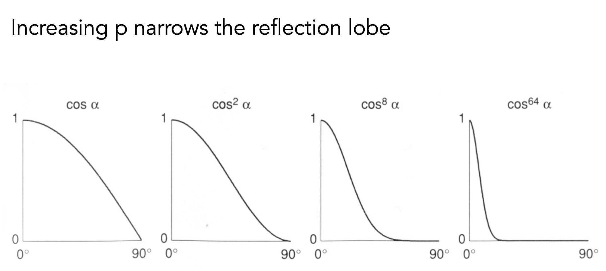 \(k_s\) 是镜面反射系数,通常认为是 1.这里还引入了一个指数 \(P\),因为 \(\cos\alpha\) 虽然确实能反映两个方向是否足够接近,但是它的容忍度太高了,我们希望只有当两个方向非常接近的时候,才能看到高光,所以我们把 \(\cos\alpha\) 做了一个幂运算,指数越大,容忍度越低,只有当两个方向非常接近的时候,\(\cos\alpha\) 才能接近 1,从而看到高光。正常情况下取 \(P\) 在 100 到 200 之间。
