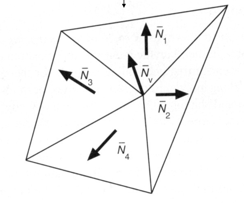 除了面着色之外,其他两种着色方法都需要求出顶点的法线,对于一个顶点来说,它肯定会和很多个三角形相连,所以它的法线可以通过这些三角形的法线求平均得到(简单平均和加权平均都可以,权重是三角形的面积)。