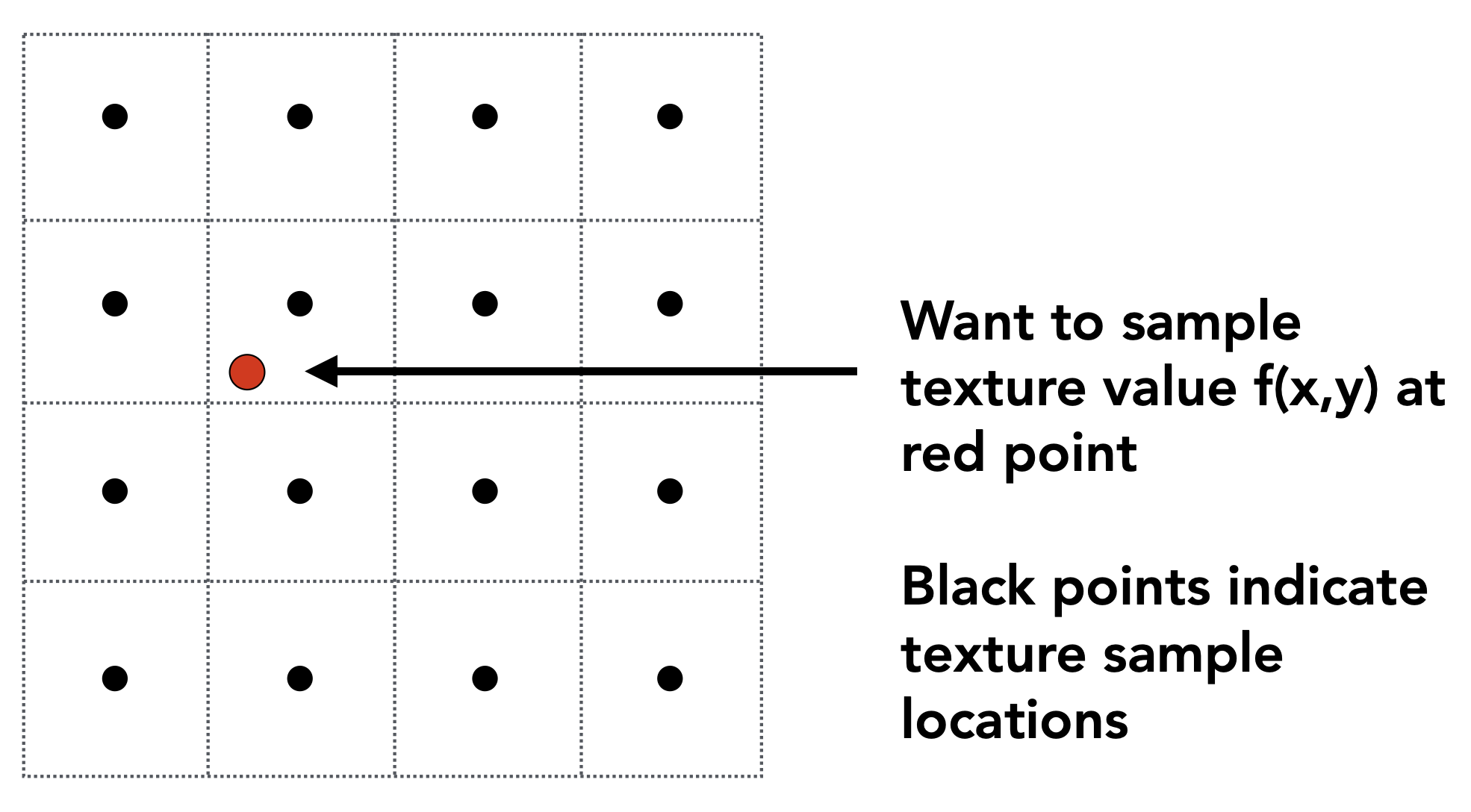 如图所示的红点是像素对应的纹理坐标,但是它不是整数,所以我们需要把它近似成整数。我们可以找到它周围的四个点,然后通过双线性插值来计算出这个点的颜色。
