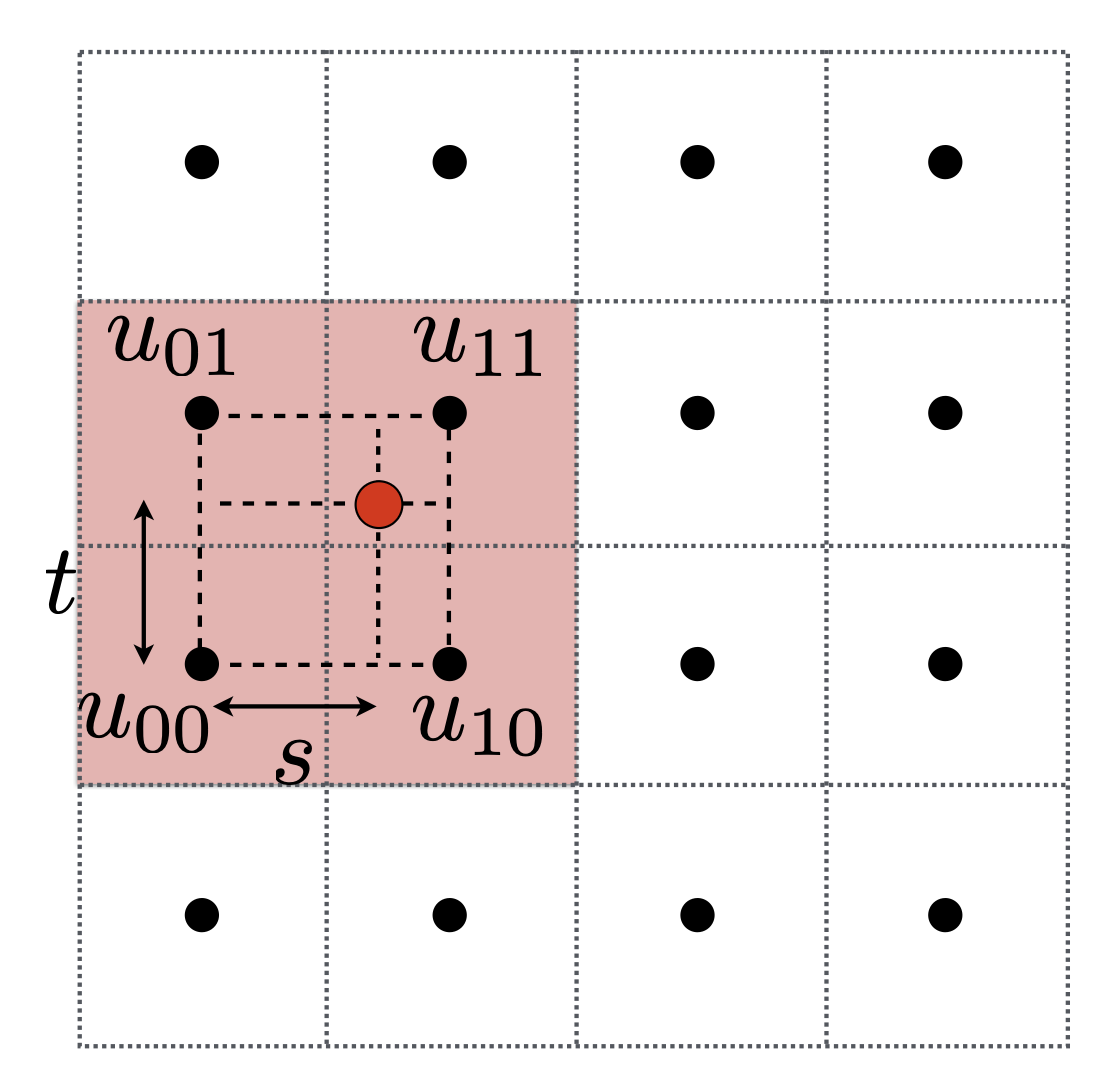 对于非整数的纹理坐标 \((u, v)\),我们可以找到它周围的四个点:\(u_{00}, u_{10}, u_{01}, u_{11}\),然后找到纹理坐标与左下角点的水平距离 \(s\),垂直距离 \(t\)。