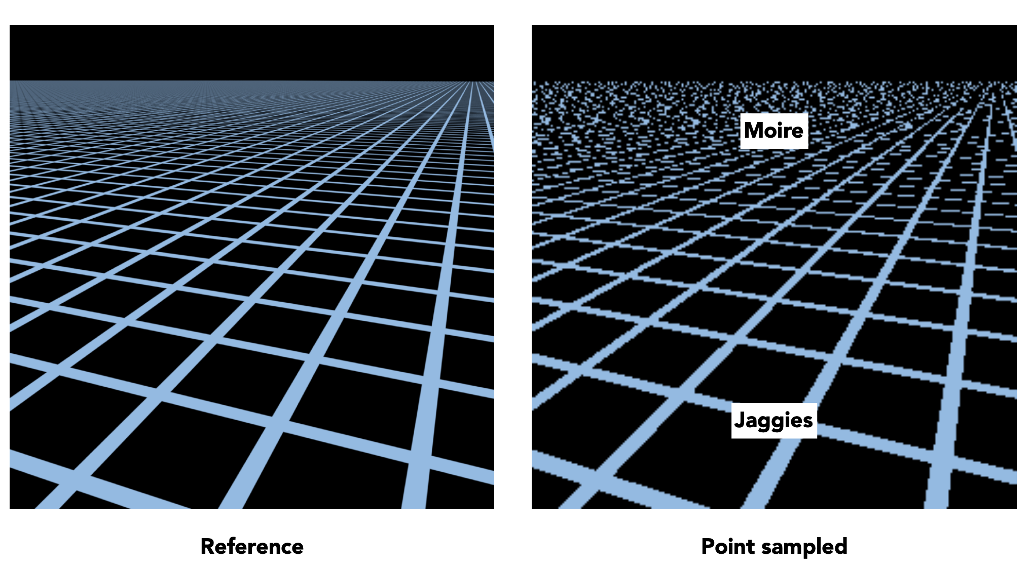 这是因为屏幕上的像素覆盖的纹理大小是不同的,近处的像素覆盖的纹理比较小,远处的像素可能会覆盖一片比较大的纹理区域。