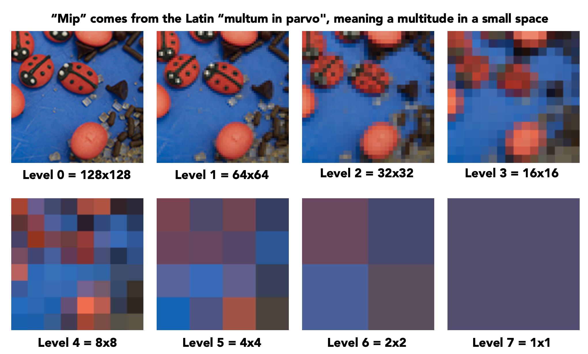 比如原图是 4 x 4 的大小,那么它的 Mipmap 第一层是 2 x 2,第二层是 1 x 1。所以我们只要去第二层取值就行了。
